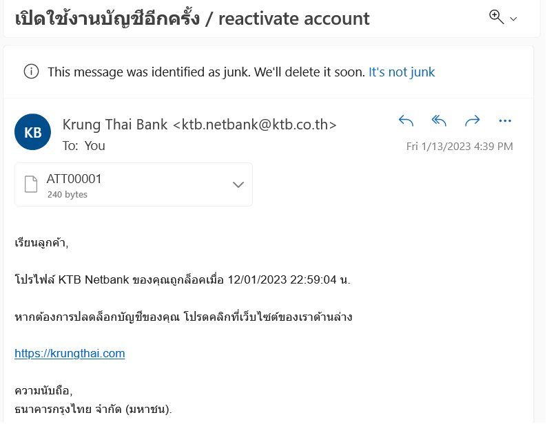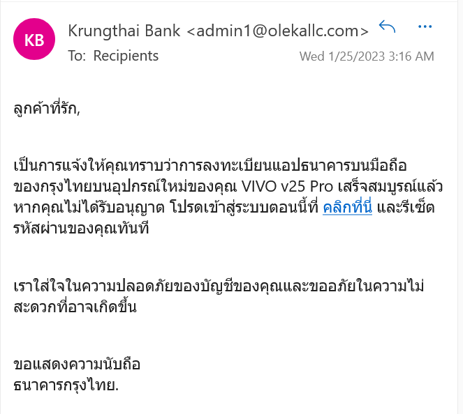 KTB ส่ง email มาแจ้งว่ามีการเปลี่ยนรหัสผ่านที่อินเดีย email นี้เป็น phishing email ค่ะ