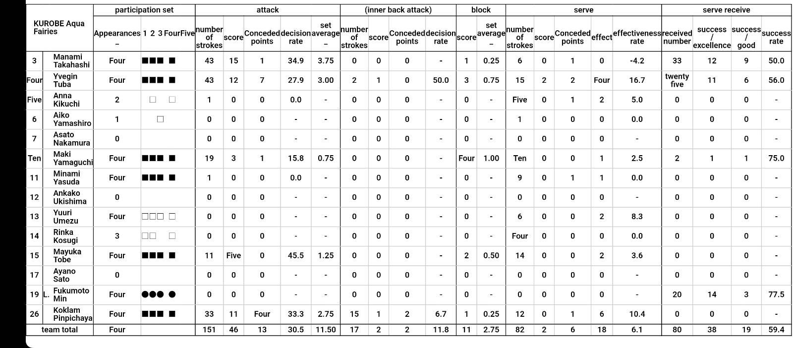 ลิบเอย - วันนี้ดี อาจจะหลุดบ้างแต่ดักรับได้หลายลูกมากๆ 7.5/10 ลิบแป้น - ก็ ดีกว่าเมื่อวันเจออิต แต่ก็หลุดบ่อยไป 6/10 พู่ - เกมส์รับดี แต่ท้ายเซต 3ย้ำเฟิร์นนเกินไป เล่นบอลเร็ว ยัดไป อาจจะได้เซตแล้วก็ได