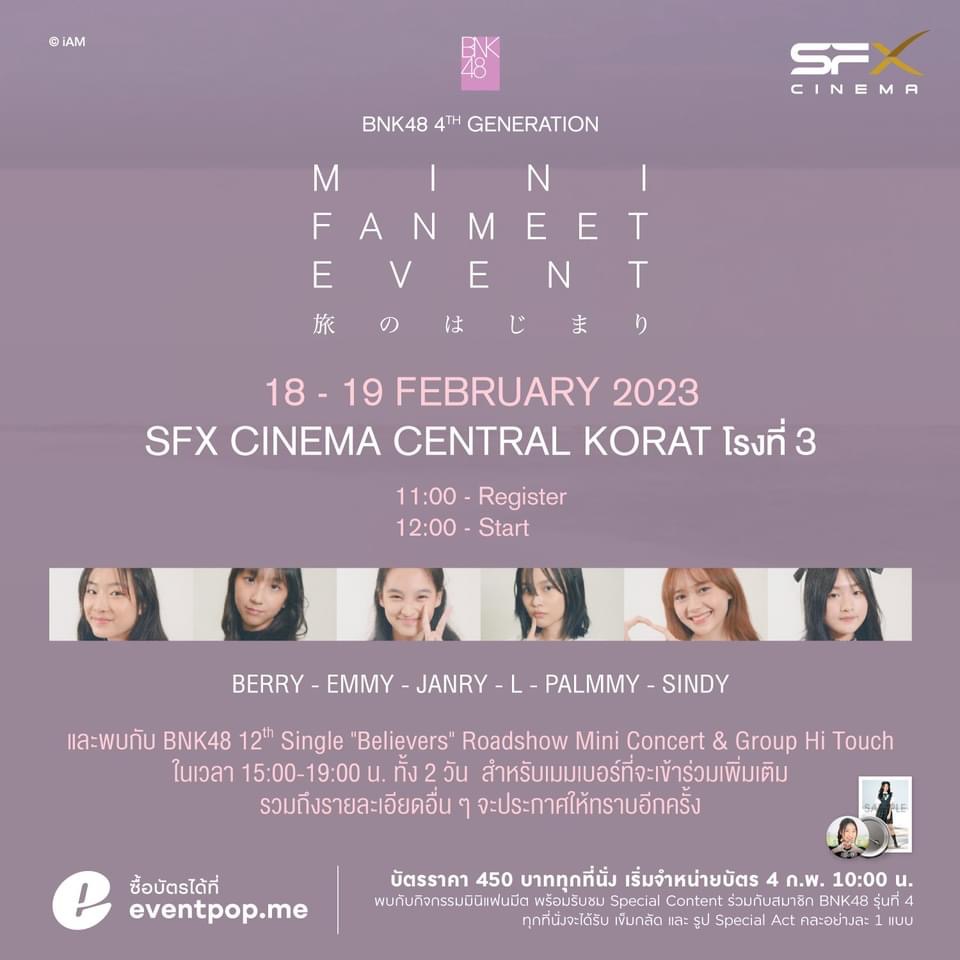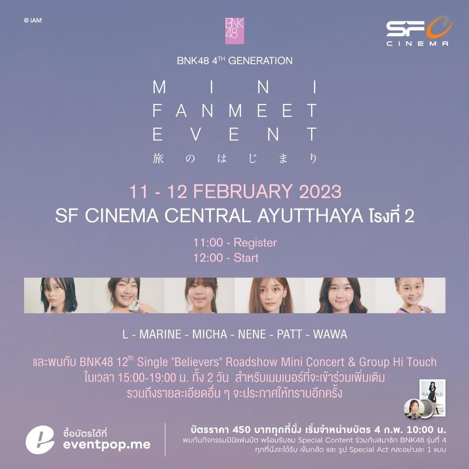หมายเหตุ: และพบกับ BNK48 12th Single “Believers” Roadshow Mini Concert & Group Hi-Touch ในเวลา 15:00-19:00 น. ที่ Central Ayutthaya ในวันที่ 11-12 กุมภาพันธ์ 2023 และ Central Korat ในวันที่ 18-19 กุมภาพันธ์ 2023