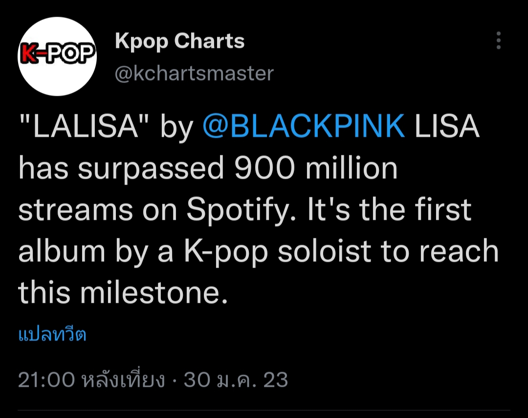 อัลบั้ม"LALISA" มียอดสตรีม Spotify ทะลุ 900 ล้านครั้ง🎉 เป็นอัลบั้มแรกของศิลปินเดี่ยว K-pop ที่ทำได้ (มีเพียง2เพลง👑)