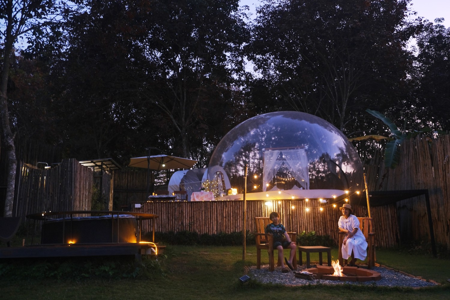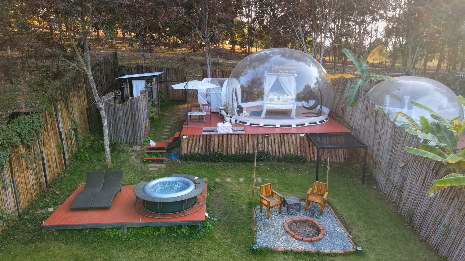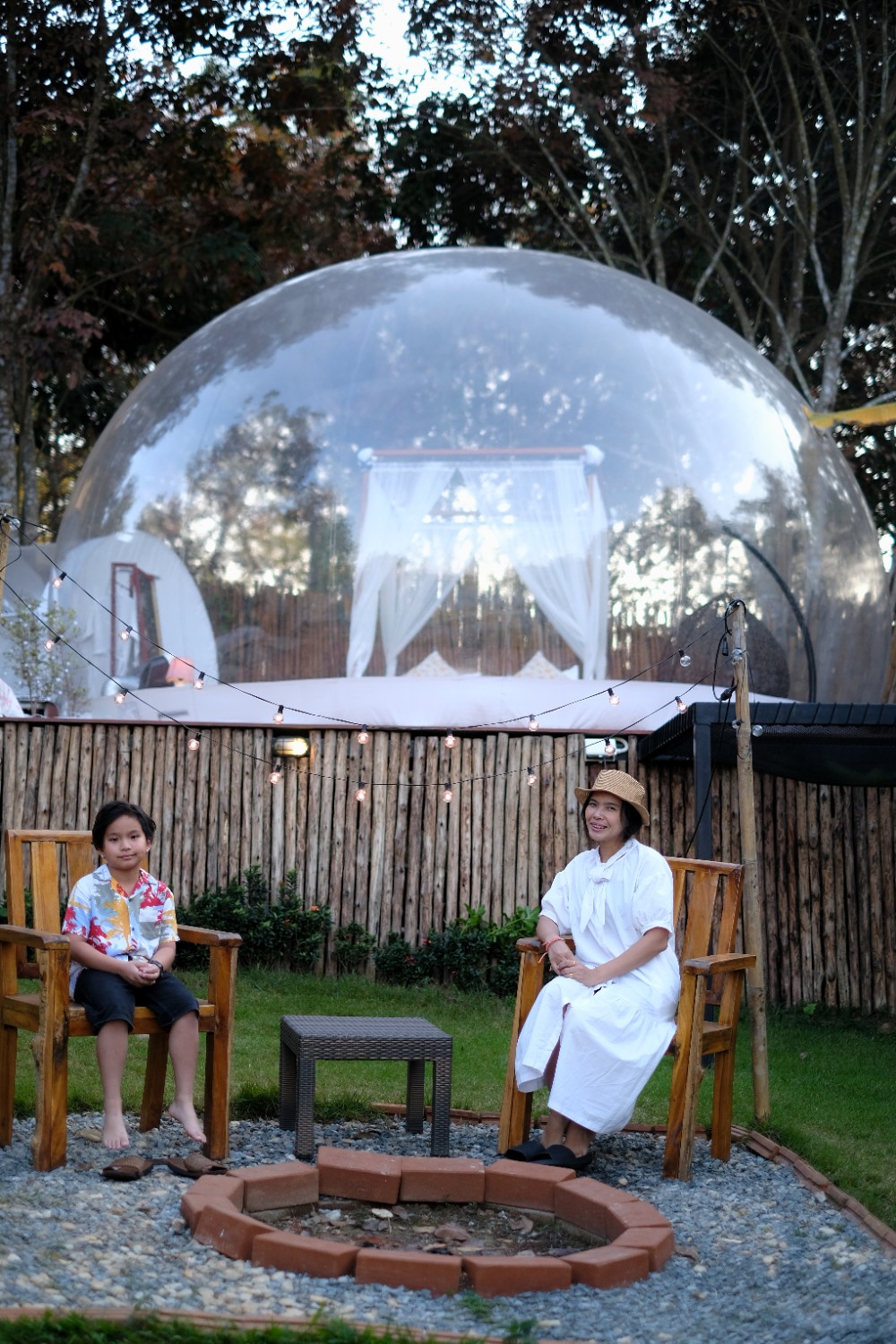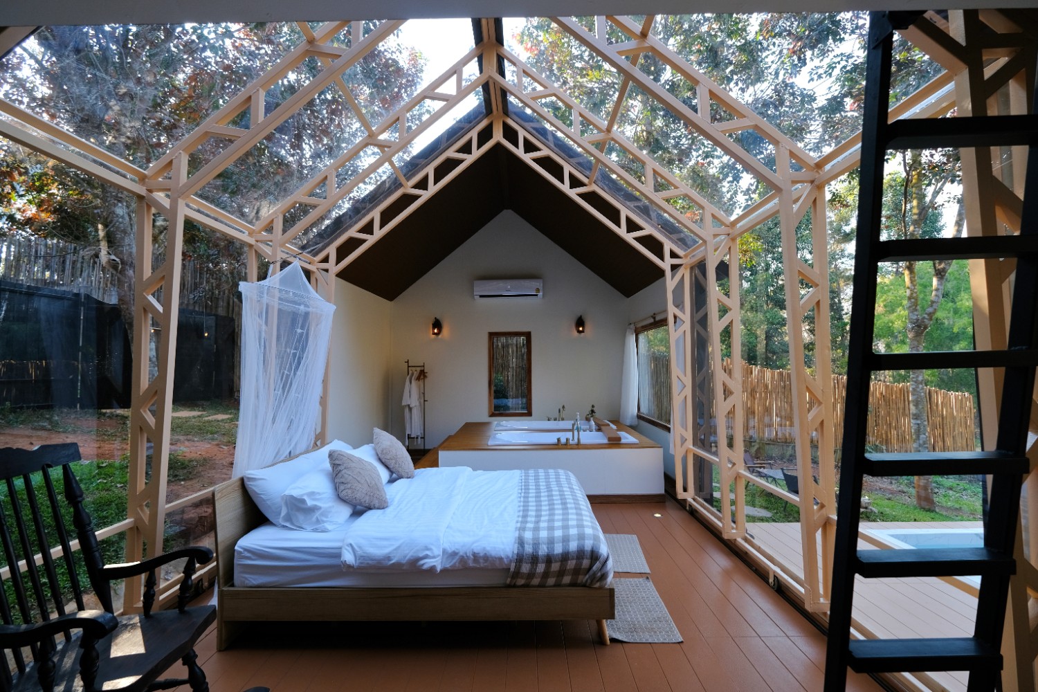 ที่พักมีเพียง 3 หลัง แบ่งเป็น ที่พักแบบโดมใส 2 หลัง และ Glass Cabin คาบิ้นกระจกใสเลื่อนได้ 1 หลัง มีธรรมชาติล้อมรอบ แบบไม่ต้องเดินทางขึ้นดอยเลย