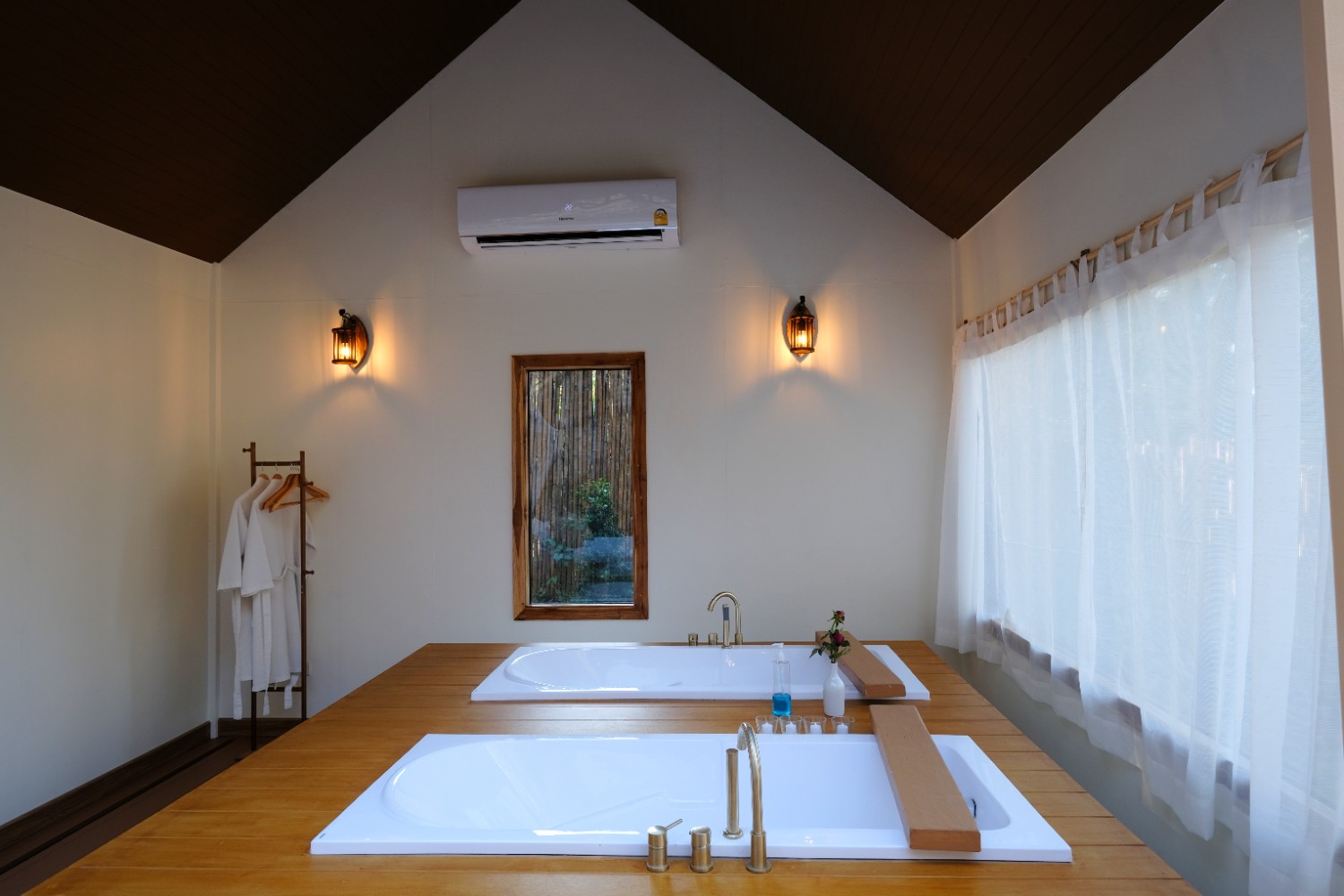 ไฮไลท์คือมีอ่างอาบน้ำชมวิว 2 อ่างแน่ะ ไม่ต้องแย่งกันเลย แถมหน้าบ้านยังมีสระว่ายน้ำส่วนตัวอีก