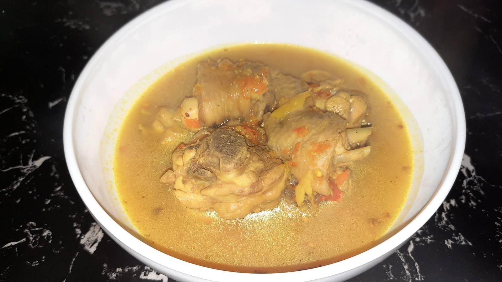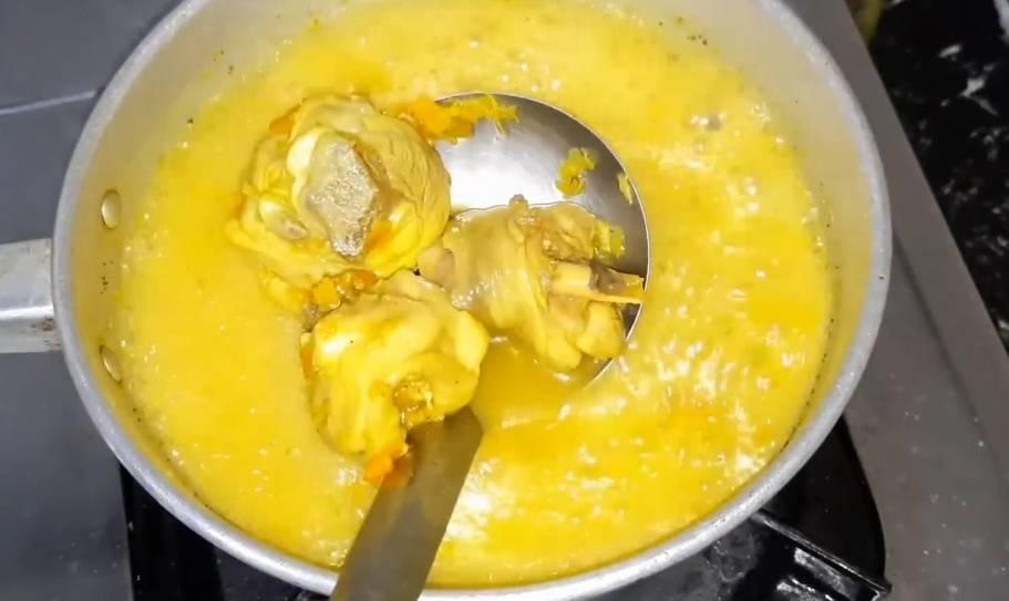 น้ำแกงเดือดแล้วใส่ไก่ลงไป ต้มจนไก่สุกแล้วปรุงรสด้วยน้ำส้มสายชู เกลือ ซีอิ๊วขาว