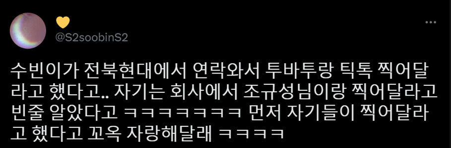 ซูบินบอกโมอาคนนี้ในแฟนไซน์ว่า ทีมฟุตบอล jeonbuk hyundai fc เป็นผู้ติดต่อเกี่ยวกับการถ่ายติ้กตอกกับทีเร้กมาเองเลย ตอนแรกซูบินก็คิดว่า hybe ติดต่อทีมฟุตบลไป แต่ทีมฟุตบอลนี่แหละคือคนที่ติดต่อไฮบ์เพื่อถ่ายTikTokกับทีเร้ก (@.translatingTXT)
