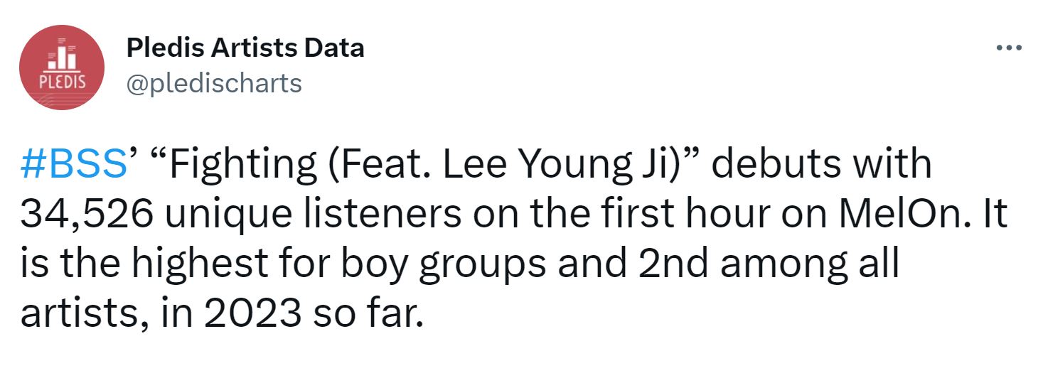 เพลง Fighting มียอด unique listeners บน Melon ชั่วโมงแรกที่ 34,526 ซึ่งสูงที่สุดในบอยกรุ๊ปและอันดับ 2 ของทั้งหมดในปี 2023 และยังสูงที่สุดของเพลง SEVENTEEN