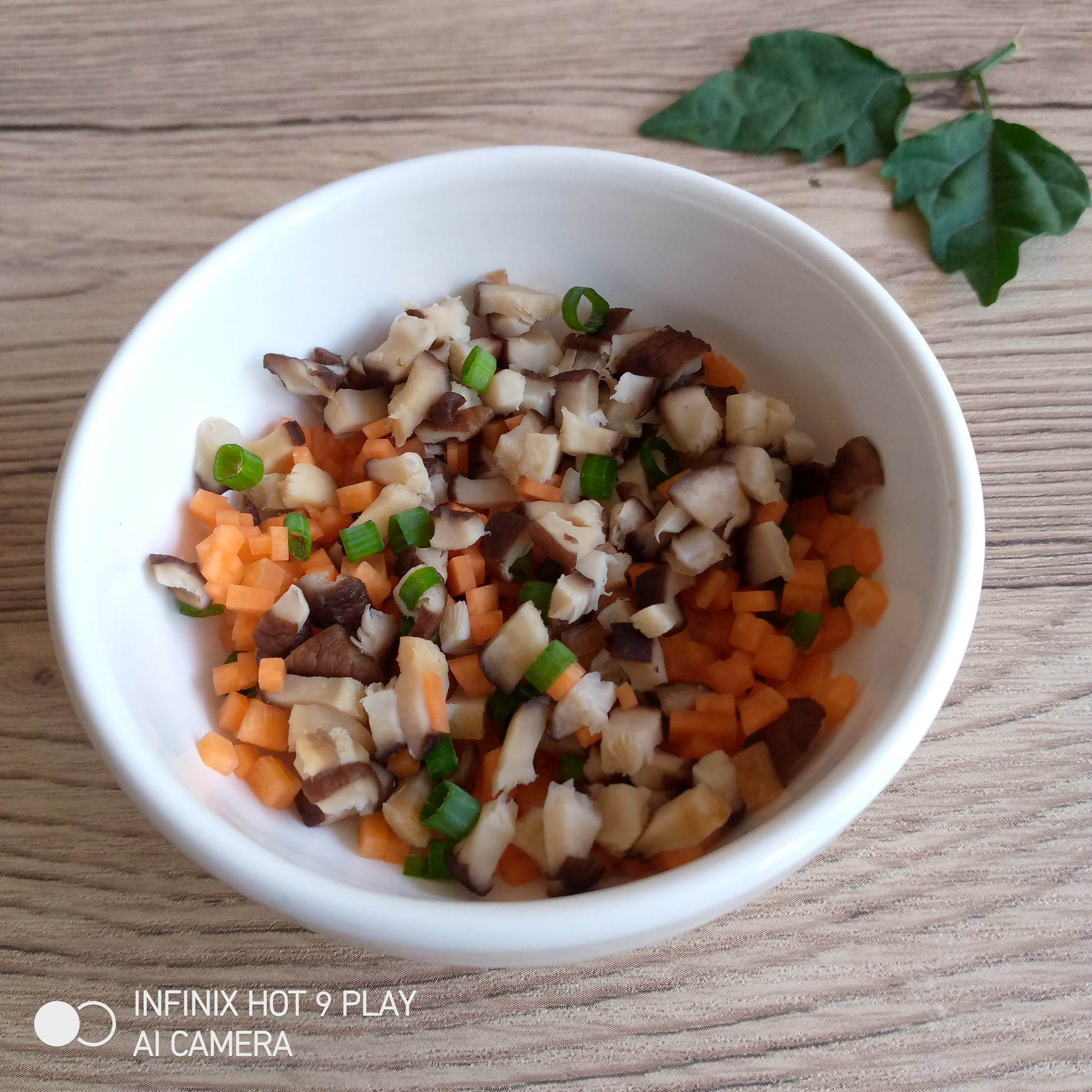 จากนั้น... ใส่เห็ดหอมสุกต้มแล้วหั่นเต๋า แครอทหั่นเต๋า และต้นหอมซอยลงไปผสมเพิ่มค่ะ แล้วแรปแช่ไว้ก่อนในตู้เย็นไว้ก่อนค่ะ (ในช่วงที่เรากำลังเตรียมอย่างอื่น)
