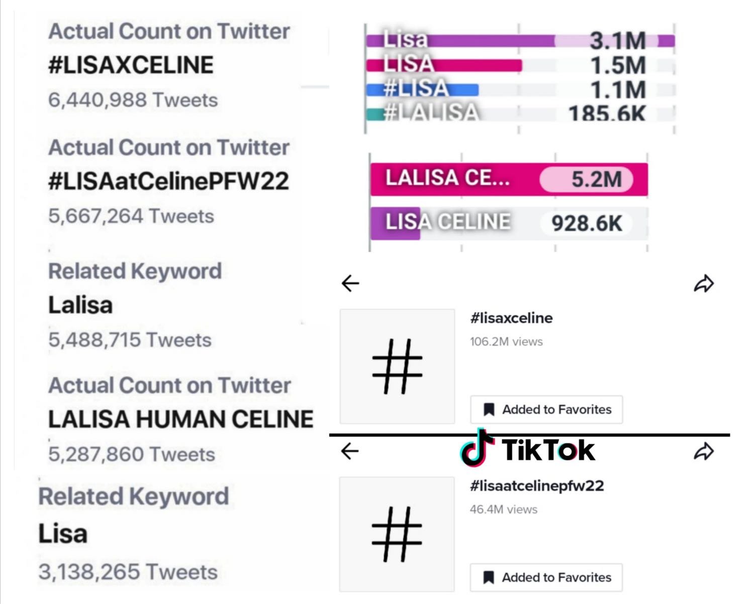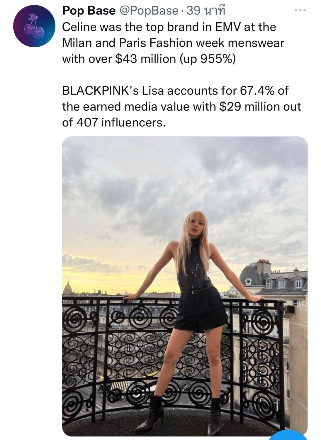 Vogue Business ประเมินว่า การโพสต์แบรนด์ Celine บนอินสตาแกรม (IG) ของลิซ่าได้สร้าง Media Impact Value หรือมูลค่าผลกระทบต่อสื่อด้วยตัวเลข 1.37 ล้านดอลลาร์สหรัฐ หรือราว 46 ล้านบาท ซึ่งเป็นตัวเลขที่มากกว่าช่องทางของ Celine