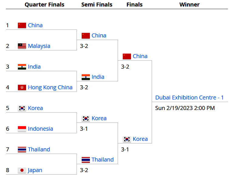 • โปรแกรม/ผลการแข่งขัน : รอบชิงชนะเลิศ [19 ก.พ. 66] (คู่แรก 17.00 น.) [เวลาทางดูไบ ช้ากว่าไทย 3 ชม.]