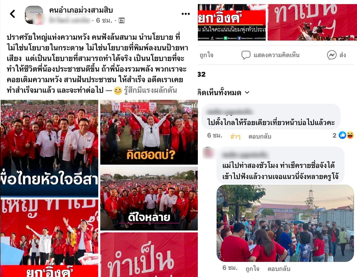 วันที่ 17 กุมภาพันธ์ ผู้สื่อข่าวรายงานว่า เสียงเชียร์ของประชาชนจำนวนมากที่มาต้อนรับ น.ส.แพทองธาร ชินวัตร ประธานคณะที่ปรึกษาด้านการมีส่วนร่วมและนวัตกรรม พรรคเพื่อไทย และหัวหน้าครอบครัวเพื่อไทย.......