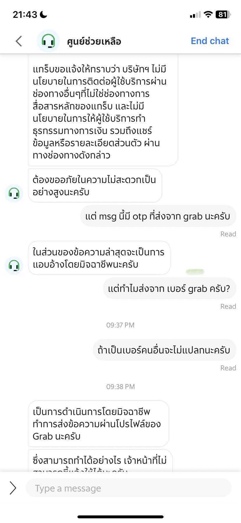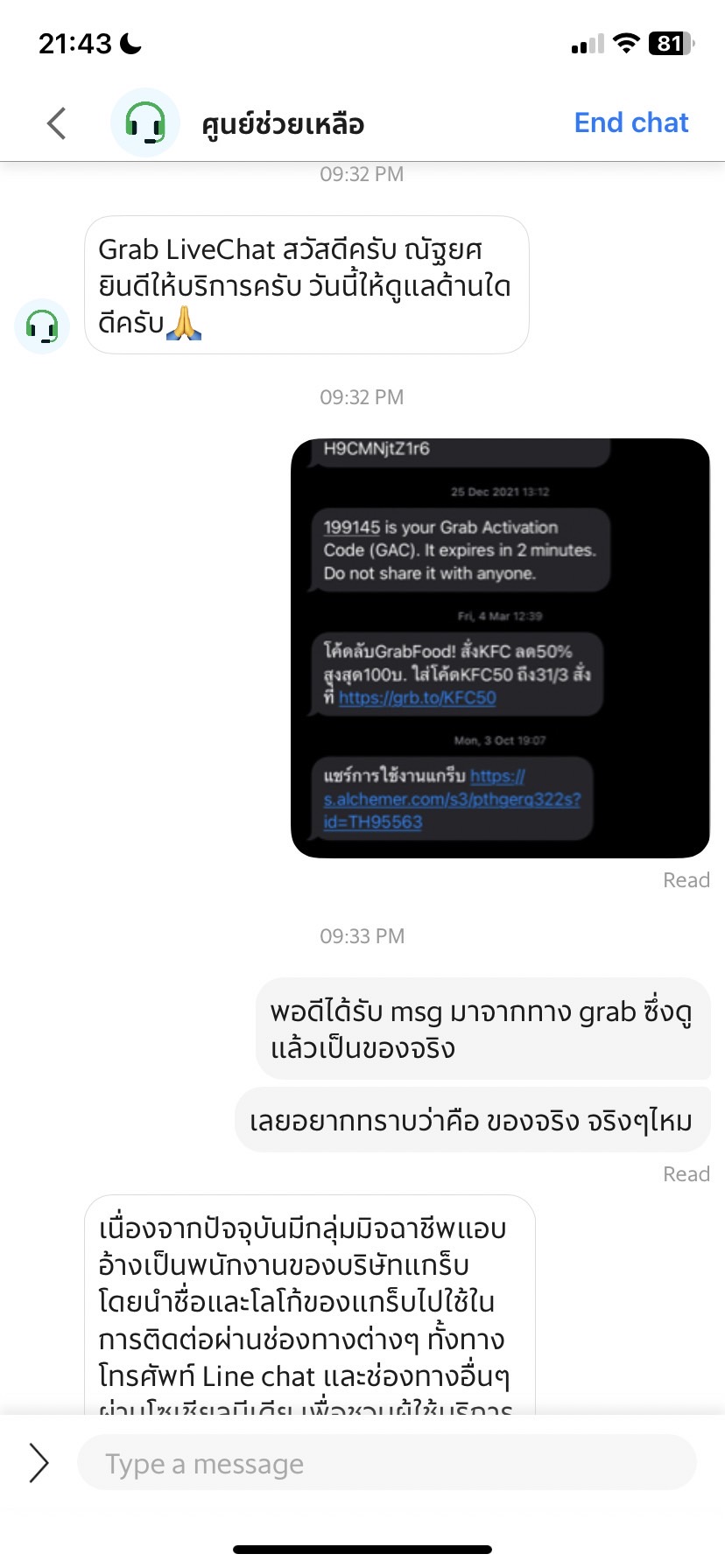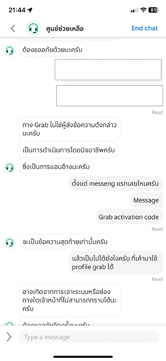 ซึ่งทาง grab ก็แจ้งว่าเค้าน่าจะโดน hack โปรไฟล์ของข้อความ ซึ่งถึงจุดนี้ผมเริ่มคิดว่า เราไม่สามารถเชื่อถือข้อความไหนได้อีกต่อไปแล้วใช่ไหม