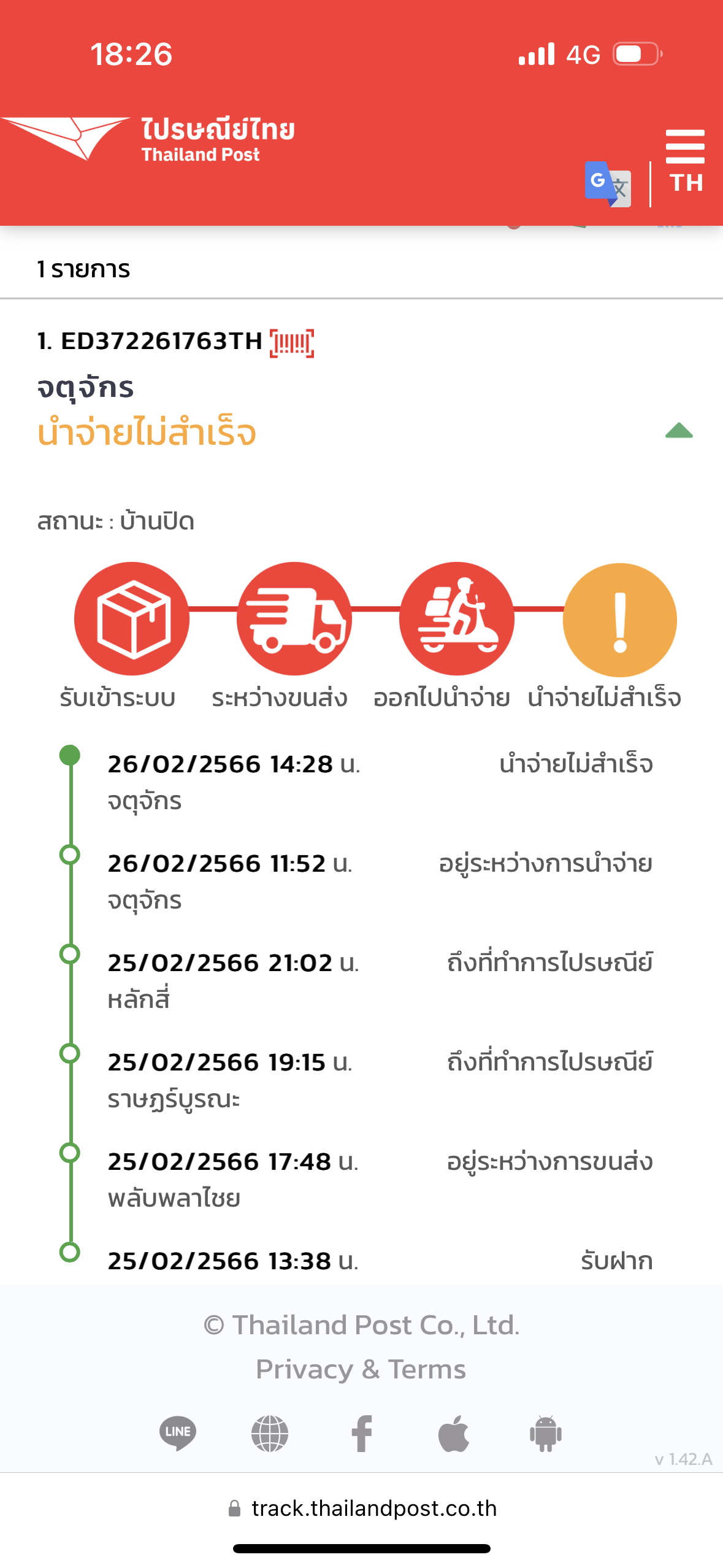 ติดตามสถานะพัสดุ ขึ้นว่า นำจ่ายไม่สำเร็จ (บ้านปิด) นำจ่ายไปรษณีย์ บางใหญ่เก่า