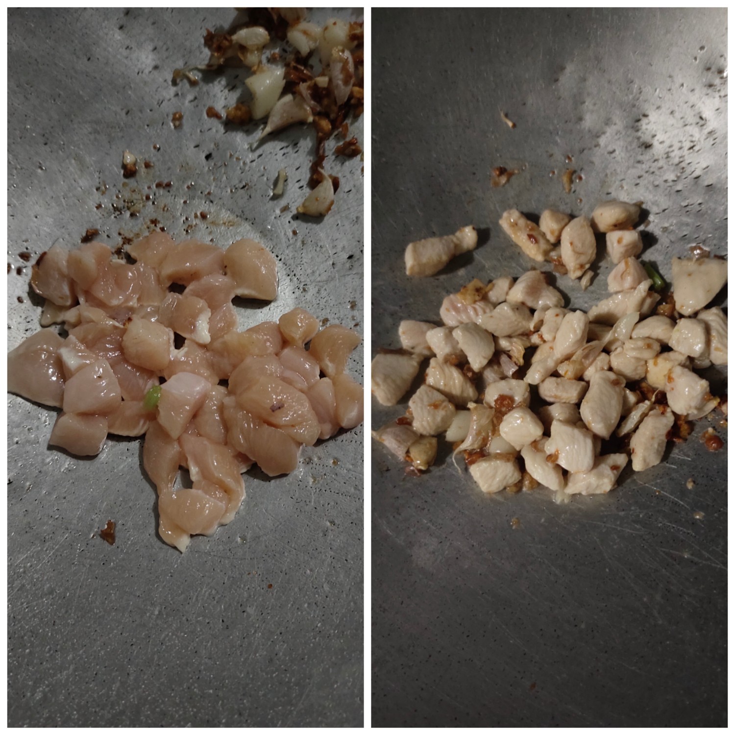 2. ใส่ไก่ลงไป ผัดกับน้ำมันจนไก่สุก จากนั้นคลุกเคล้ากับกระเทียมให้เข้ากัน