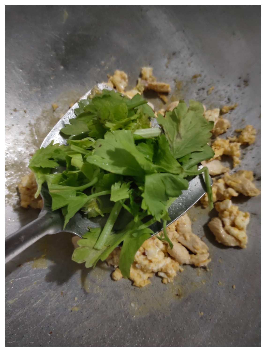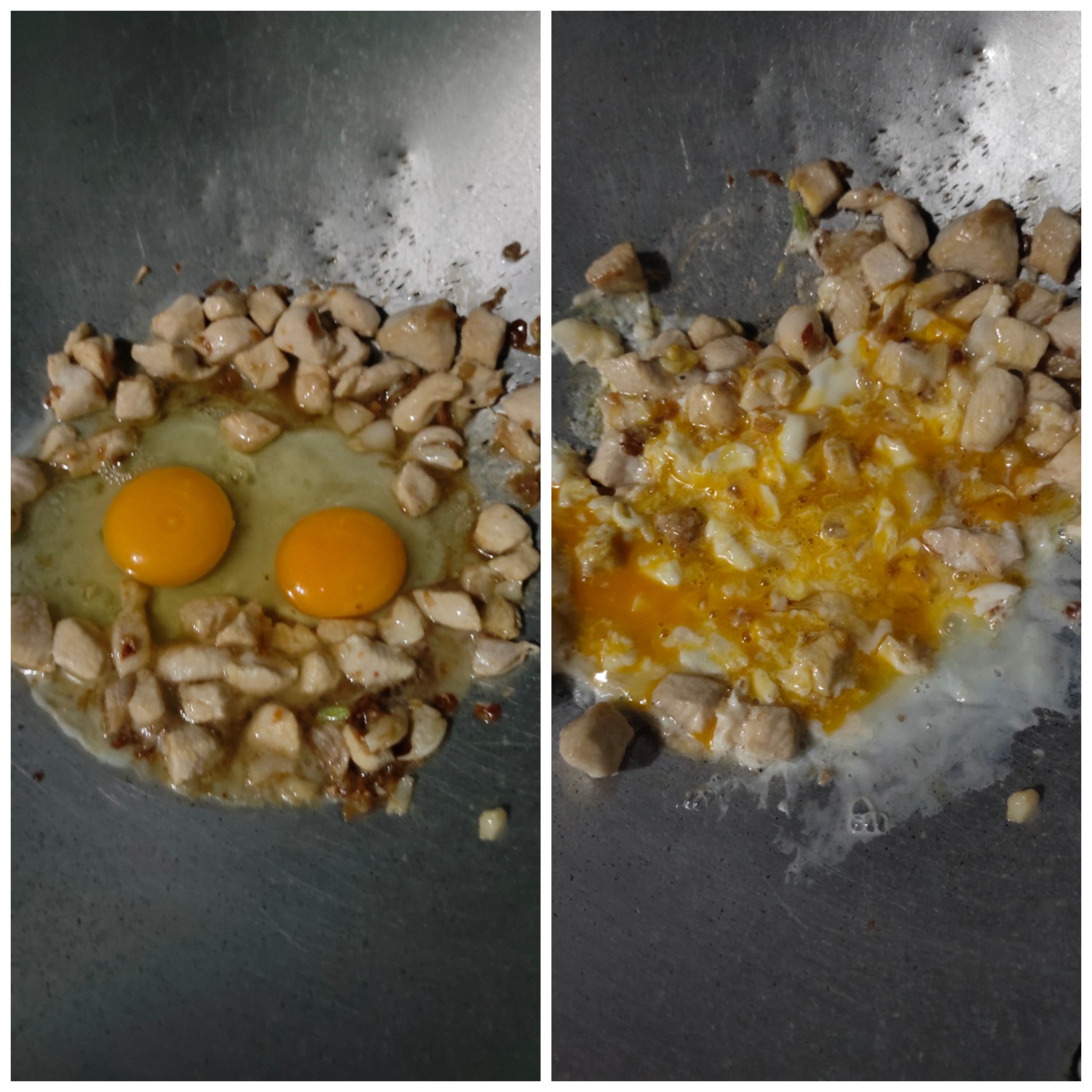4. ใส่ไข่ลงไป รอจนไข่ขาวสุกเป็นแผ่นก่อน (ให้ไข่ขาวแยกสีกับไข่แดง เพื่อให้สีสันสวยงามและเนื้อไข่ละมุน) จึงค่อยใช้ตะหลิวยีไข่ ผัดให้เข้ากันกับไก่