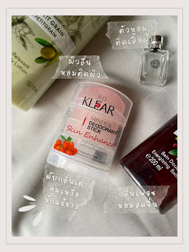 ตัวหอมแล้ว รักแร้จะเหม็นไม่ได้ ยิ่งเป็นคนเหงื่อเยอะ ยิ่งต้องดูแลเป็นพิเศษ เราจะใช้เป็นสารส้มธรรมชาติ ในรูปแบบแท่งของ deoklear กลิ่นโกจิเบอร์รี่ เคยลองยี่ห้ออื่นแล้วบาดผิว ไม่มั่นใจว่ามันมีความกระด้างเกินไปหรือเปล่า แต่ยี่ห้อนี้รอด! เพราะช่วยทั้งลดเหงื่อ คุมกลิ่นตัวระหว่างวัน ไม่ทิ้งคราบ และถ้าใช้ต่อเนื่องเกิน 2 เดือน ยังช่วยเรื่องปรับผิววงแขนให้ดูไบรท์ขึ้นด้วย เราชอบที่นางใช้ได้ทั้งหลังอาบน้ำและก่อนนอนเลย ไม่จำเป็นต้องออกจากบ้านแล้วค่อยทา คือทาระหว่างวันหรือก่อนนอนก็ได้ ความธรรมชาติของนาง ทำให้ไม่ทิ้งสารตกค้างหรือทำให้วงแขนเหนอะหนะเหมือนพวกโรลออนทั่วไป ไอเท็มนี้สำคัญมากเพราะเป็นพื้นฐานที่ทำให้ตัวเราหอมเลย ตราบใดที่เหงื่อไม่ออก กลิ่นตัวก็จะปั๊วปังตลอดเวลา