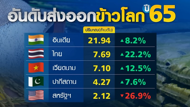 หลังจากที่อันดับการส่งออกข้าวของไทยร่วงลงมาอยู่อันดับ 3 แต่ในปี 2565 ไทยก็แซงขึ้นไปอยู่อันดับ 2 ได้สำเร็จ แต่ปริมาณส่งออกยังห่างจากอันดับ 1 เยอะมาก
