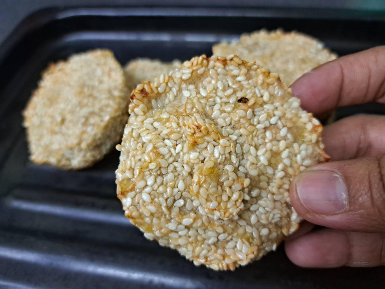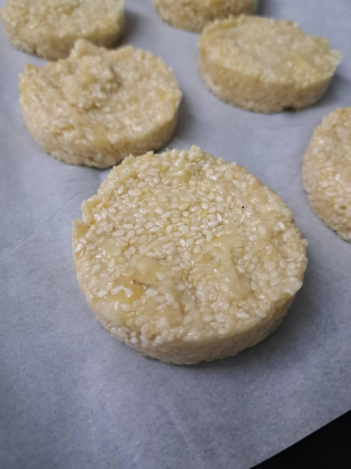บดกล้วยให้ละเอียด ใส่งาลงไปผสมให้เข้ากัน ตักใส่พิมพ์กลม เข้าอบ