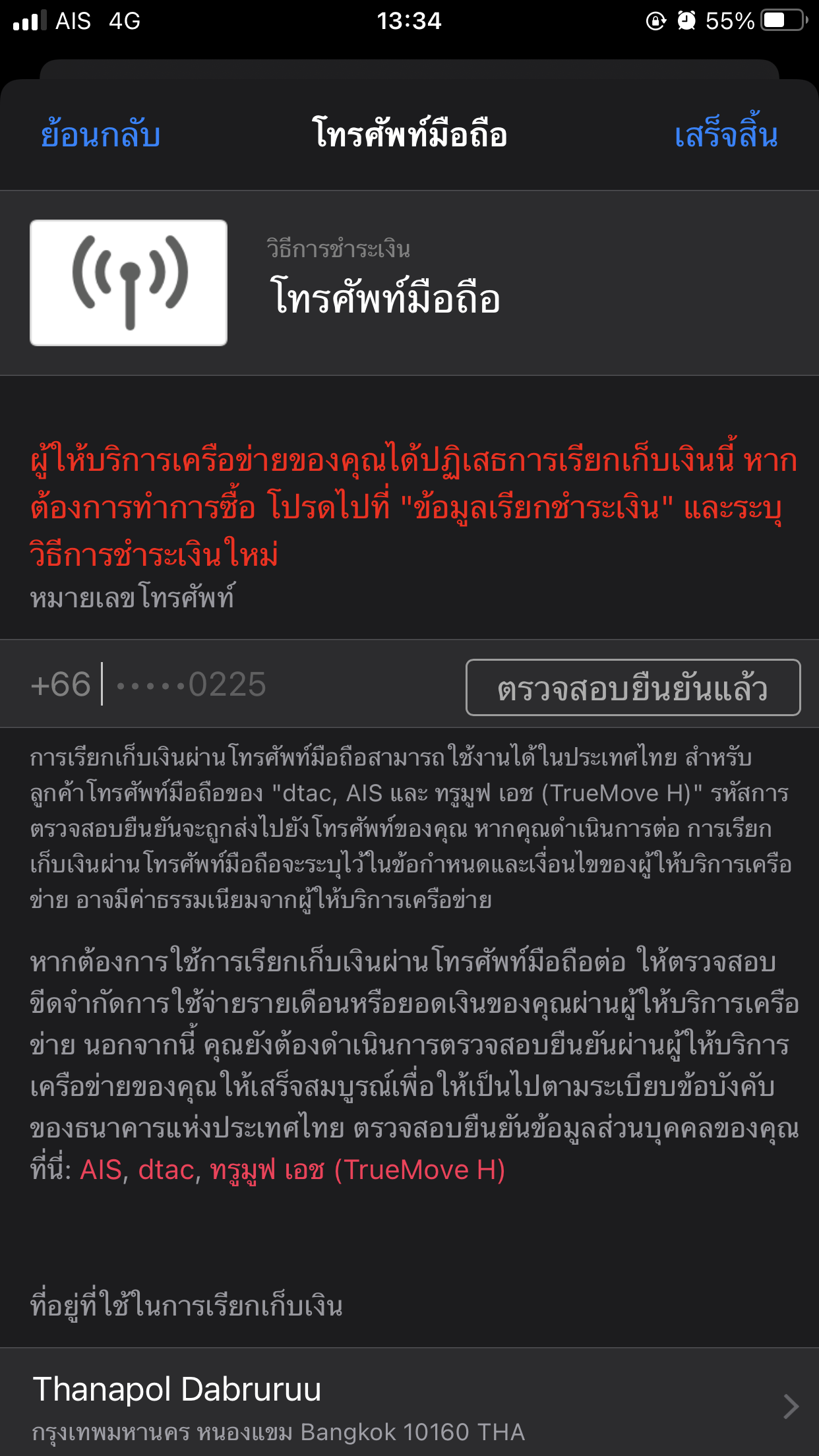 Ios เติมเกมไม่ได้ครับมันบอกว่า ผู้ให้บริการเครือข่ายของคุณได้ปฏิเสธการเรียกเก็บเงินนี้