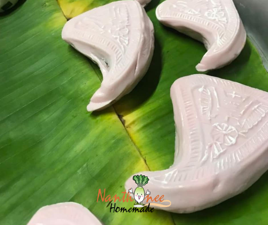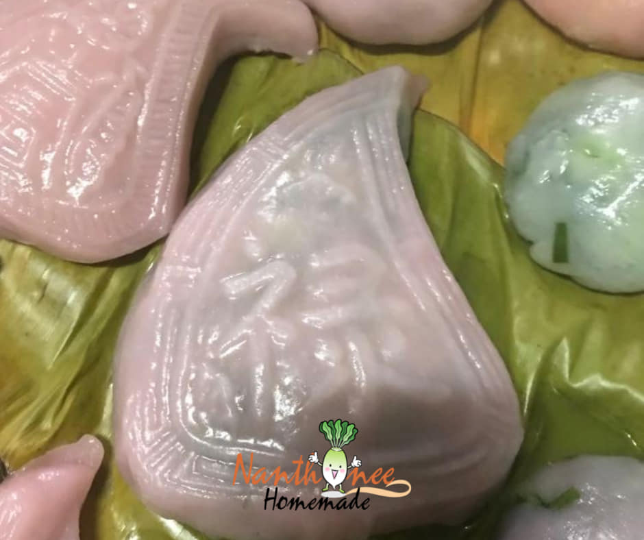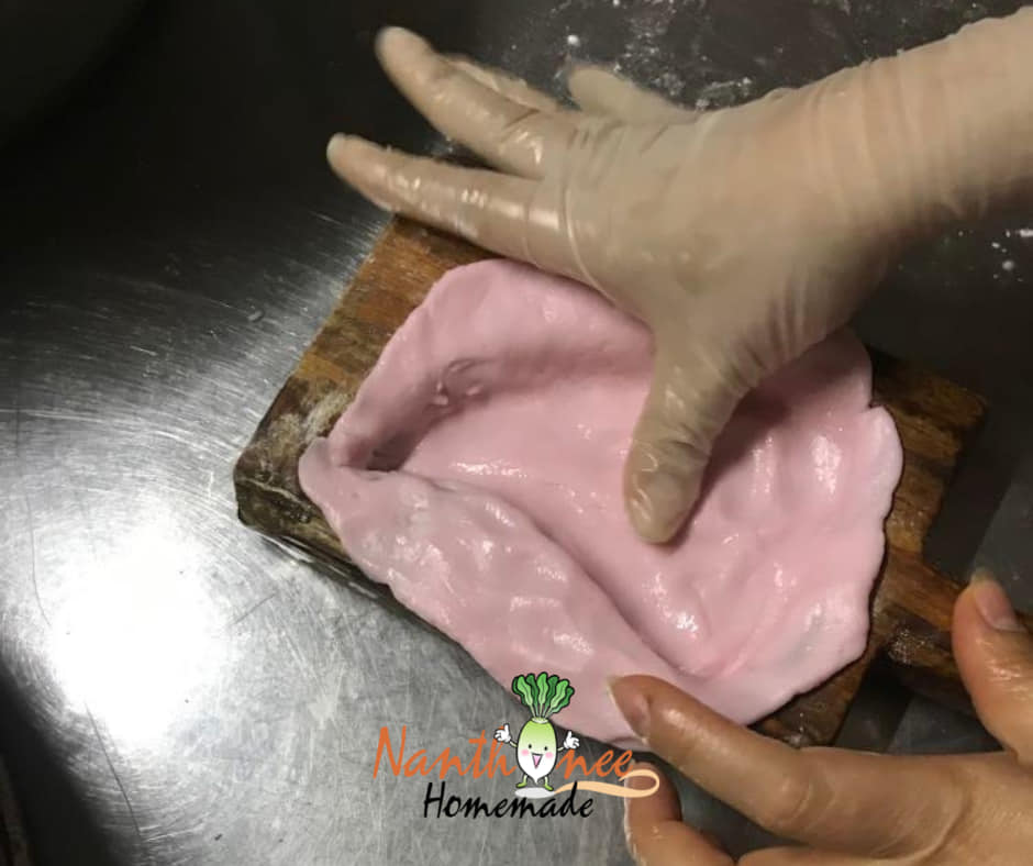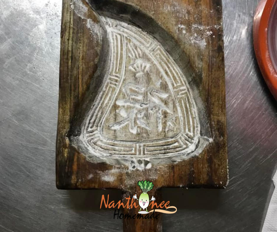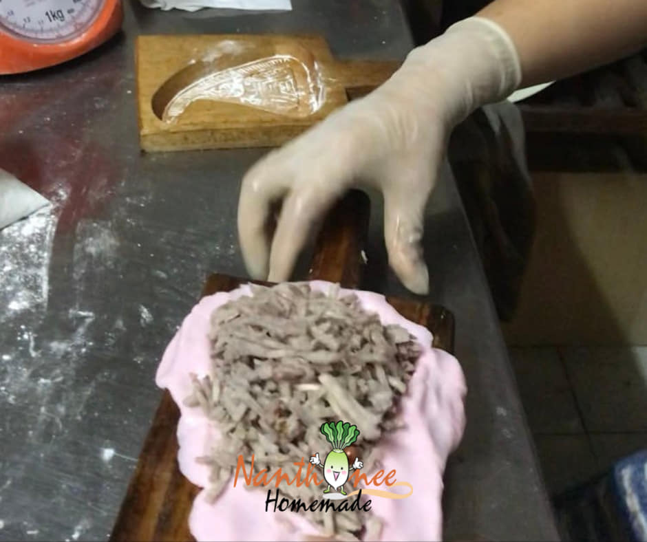 แป้งสีชมพูน้ำหนักไม่กี่สิบกรัมถูกบรรจงกรุลงในพิมพ์ไม้ลายอักษรจีน ก่อนตัวไส้ (ทะลักล้น) จะถูกตักใส่บนตัวแป้ง และค่อยๆใช้ความพยายามเก็บตัวไส้อันนูนสูงให้อยู่ภายในตัวแป้งอันน้อยนิดนี้ให้ได้ ไม่แค่นั้นนะคะ ต้องใช้มือแต่งขอบมุมแป้งให้เป็นสันตามพิมพ์ เพื่อเวลานึ่งออกมาแล้วหน้าขนมจะได้นูนสวยงาม ไม่แบนเรียบเหมือนปัจจุบัน