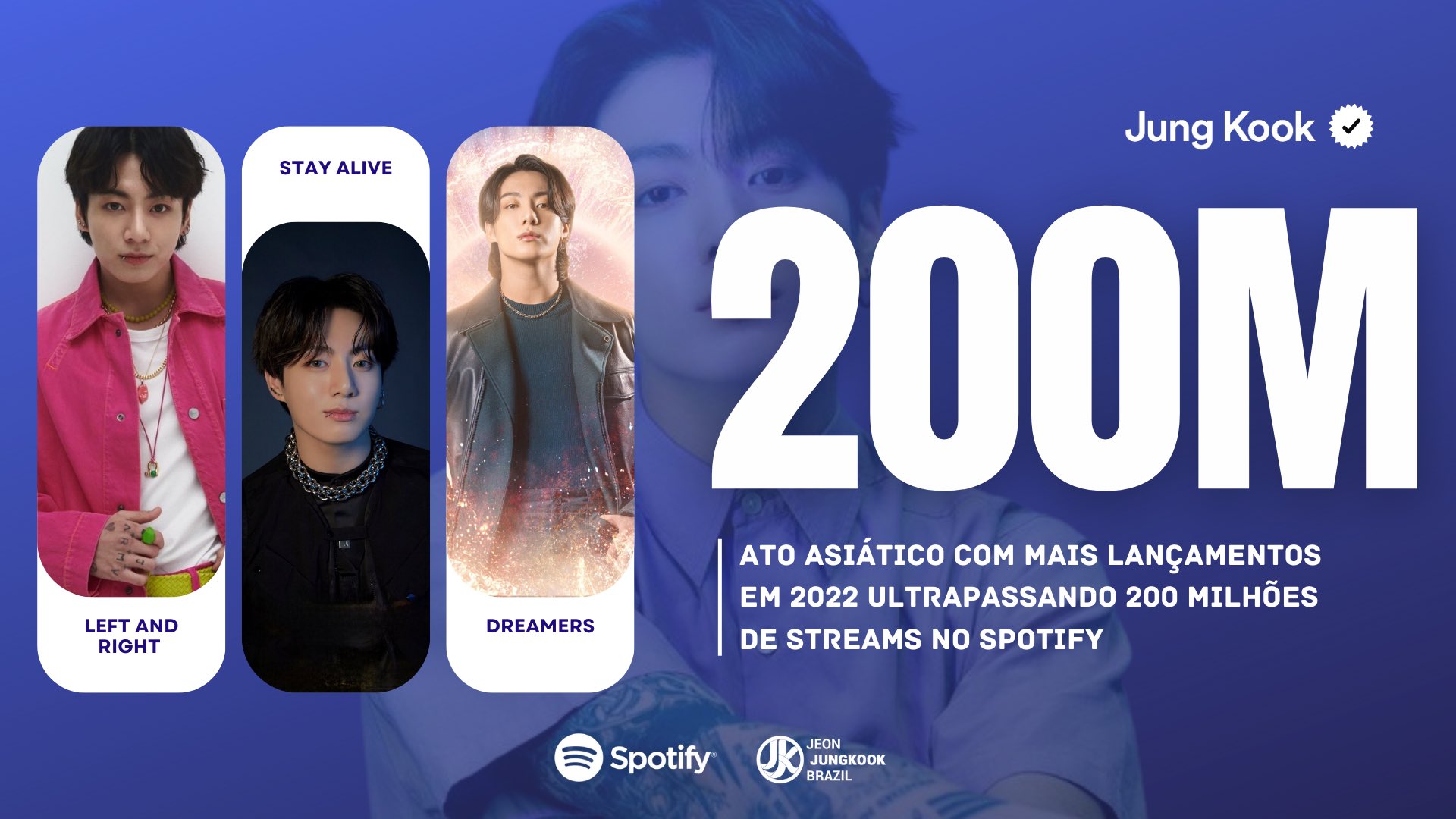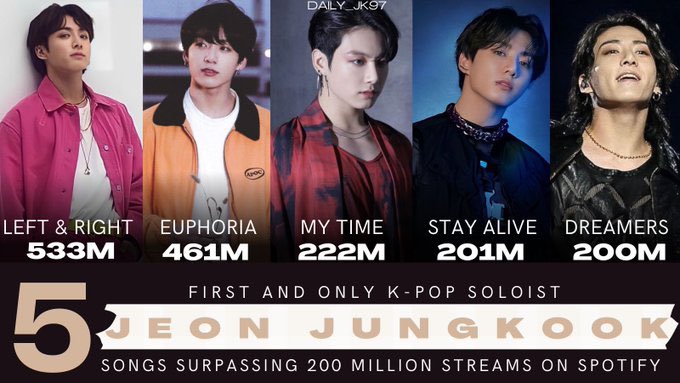 จองกุก เป็นศิลปินเดี่ยว K-Pop คนแรกที่มียอดสตรีมทะลุ 10,000 ล้านครั้งบนโปรไฟล์ Spotify ของเขา! นอกจากนี้ เขายังเป็นศิลปินเอเชียที่ทำสถิตินี้ได้เร็วที่สุดอีกด้วย การจัดอันดับศิลปิน K-Pop ที่ทำยอดสตร