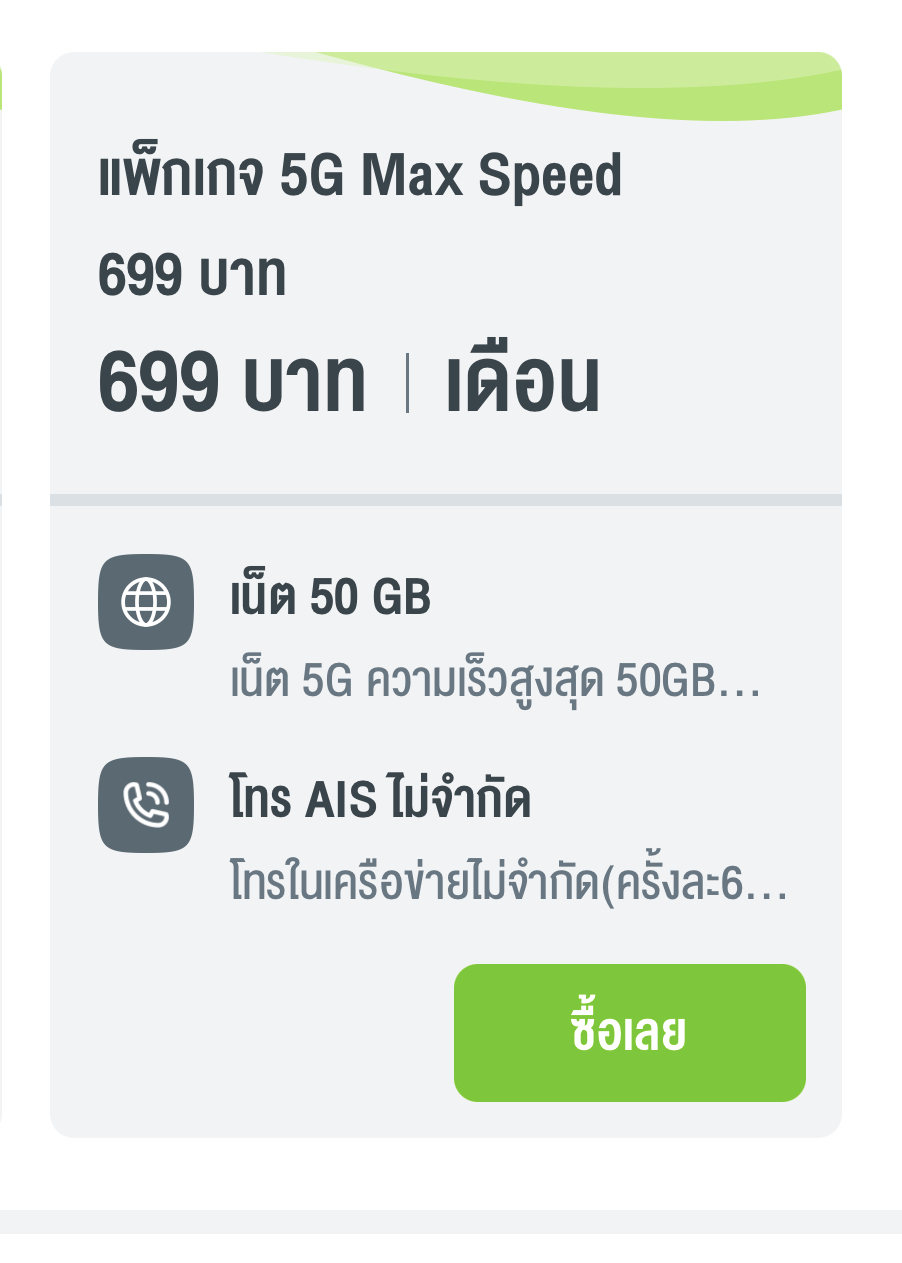 ข้อเสนอพิเศษกว่าเดิม! AISให้คุณเล่นเน็ตที่ความเร็วสูงขึ้นเป็น 5G ความเร็วสูงสุด 20GB พร้อมเน็ตเร็ว 15Mbps จำนวน 70GB หลังจากนั้นเร็ว 1Mbps โทรฟรีทุกเครือข่ายครั้งละ 15 นาที พร้อม AIS SUPER WiFi ไม่จำก