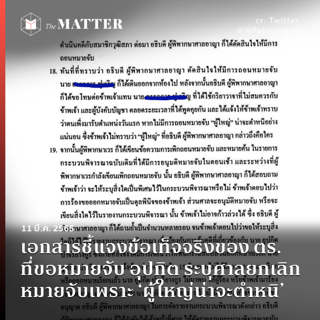 เอกสารชี้แจงข้อเท็จจริงของ ตร. ที่ขอหมายจับ อุปกิต ระบุศาลยกเลิกหมายจับเพราะ ‘ผู้ใหญ่น่าจะตำหนิ’