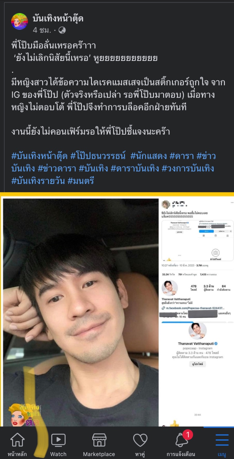 มีหญิงสาวได้ข้อความไดเรคแมสเสจเป็นสติ๊กเกอร์ถูกใจ จาก IG ของพี่โป๊ป (ตัวจริงหรือเปล่า รอพี่โป๊บมาตอบ) เมื่อทางหญิงไม่ตอบโต้ พี่โป๊ปจึงทำการบล็อคอีกฝ่ายทันที