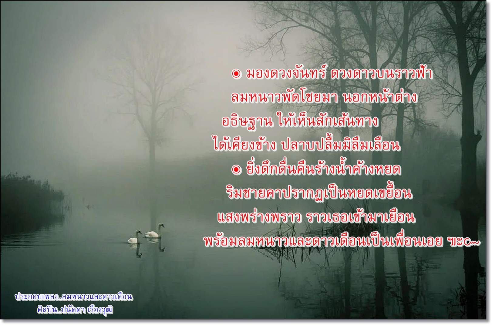 0 ที่เห็นทอดยาวไกลคงใฝ่ฝัน ด้วยในชาติมีชั้นคอยกั้นขวาง ไม่รู้หนาวรู้ร้อนจึงว่อนวาง ลงแทรกกลางบทกรรมชี้นำไป 0 ปราศใบไม้สายลมและแสงแดด มีเพียงแวดล้อมขวัญกับฝันใฝ่ และเพียงหวานหอมกลั้วกับหัวใจ กับรันทดอา