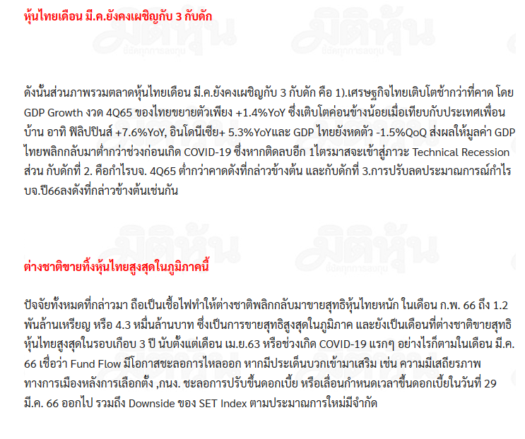 กลยุทธ์การลงทุน เราประเมินว่าภายหลังจากที่เฟดเดินหน้าขึ้นPolicy rate มาถึงระดับ 4.75% และ Terminal rate ที่5.5% เพื่อสกัดเงินเฟ้อ แต่ในขณะเดียวกับเราเริ่มเห็นผลกระทบของภาวะ Inverted yield curve ที่ส่งผลกดดันอัตรากำไรของกลุ่มธนาคาร รวมถึง Financial Stability ภาพสัญญาณของ SVB ประกอบกับการชะลอตัวลงของ Wage growth อาจเป็นหนึ่งในเหตุผลที่เฟดอาจกลับมาพิจารณาเรื่องนโยบายการเงินในระยะกลางอีกครั้ง ล่าสุด โอกาสของการขึ้นดอกเบี้ย 50bps ในการประชุม FOMC วันที่ 23มีนาคม ถูกปรับลดลงเหลือ ต่ำกว่า 30% จากเดิมที่ 75-80% ในขณะที่อัตราผลตอบแทนพันธบัตร2ปีสหรัฐ ได้มีการ price out ดอกเบี้ย 25bps