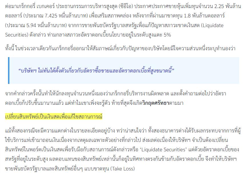 ภาพดังกล่าวเกิดขึ้นภาพหลังธนาคารประสบปัญหาการปรับขึ้นตัวของอัตราผลตอบแทนพันธบัตรรัฐบาลในช่วง 1-2ปีที่ผ่านมา (นั่นหมายถึงราคาพันธบัตรที่ดิ่งลงอย่างมาก) ทำให้เผชิญกับการขาดสภาพคล่องในระยะสั้น