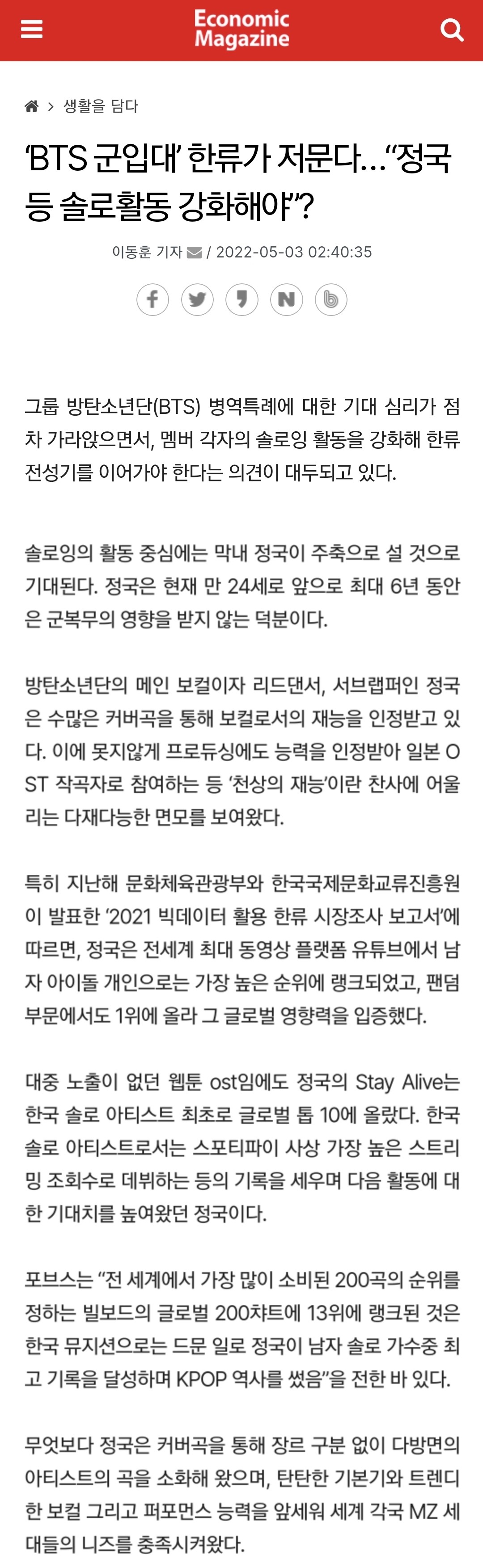 1. [+442, -12] นิตยสารเศรษฐกิจยังวิเคราะห์ด้วยว่าจองกุกต้องเพิ่มกิจกรรมเดี่ยวเพื่อปกป้อง "ฮันรยู" ของเกาหลี