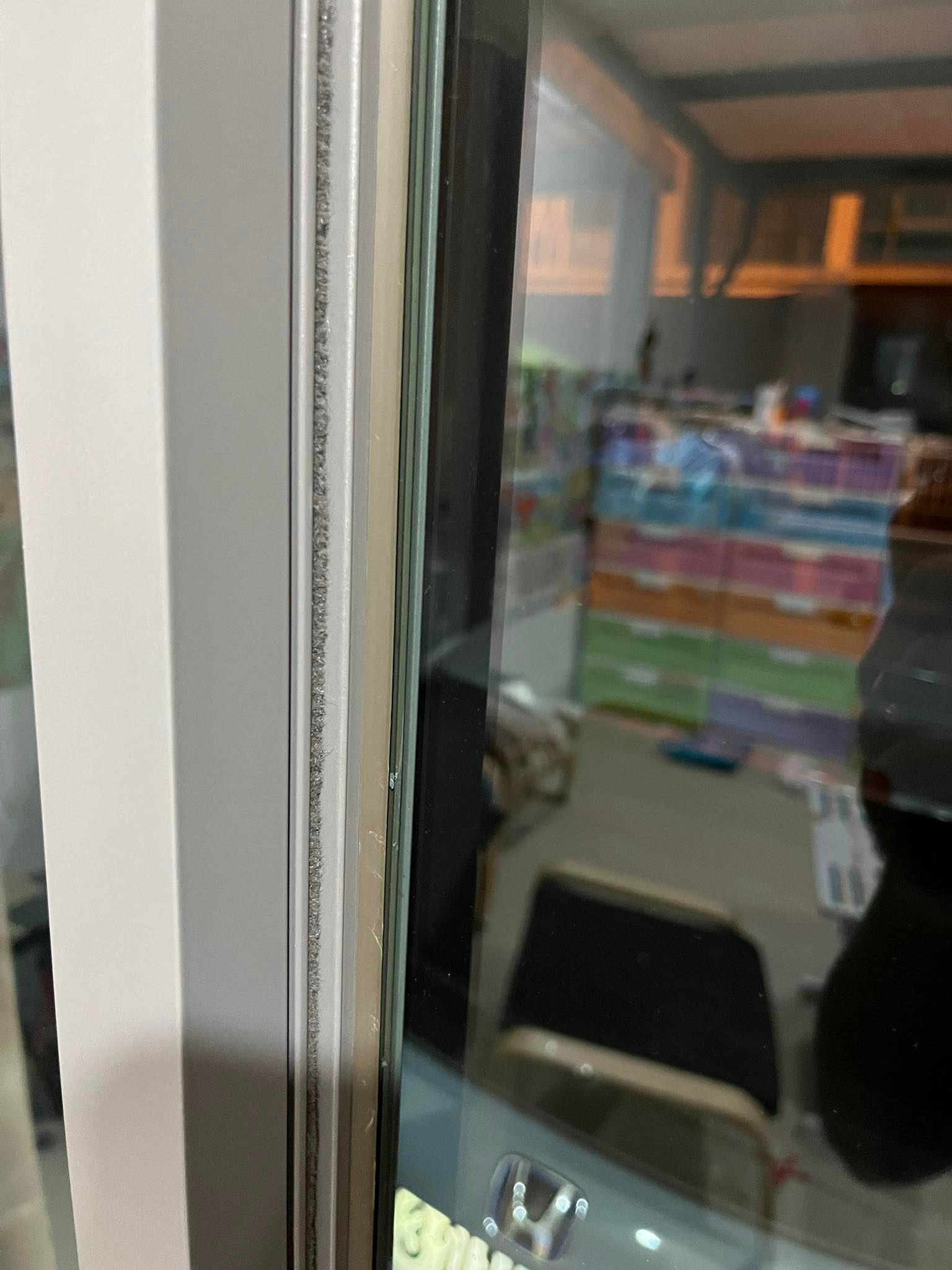 ช่างมารื้อกระเบื้องแล้ว น่าจะทำให้รางบานเลื่อนกระจกโก่งขึ้นเล็กน้อย. ทำให้เปิดประตูลำบาก. ต้องใช้มือจับขอบบานด้านล่างๆถึงจะเลื่อนได้...สังเกตเห็นว่ารางช่วงกลาง มีการโก่งโค้งขึ้นมาเล็กน้อย...รูปอาจจะ