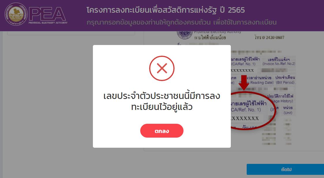ลงทะเบียนผู้ใช้ไฟฟ้า ขึ้นแบบนี้ คืออะไรครับ ผมพยายามลงทั้งวันยังไม่มีการบอกว่าผ่านเลย