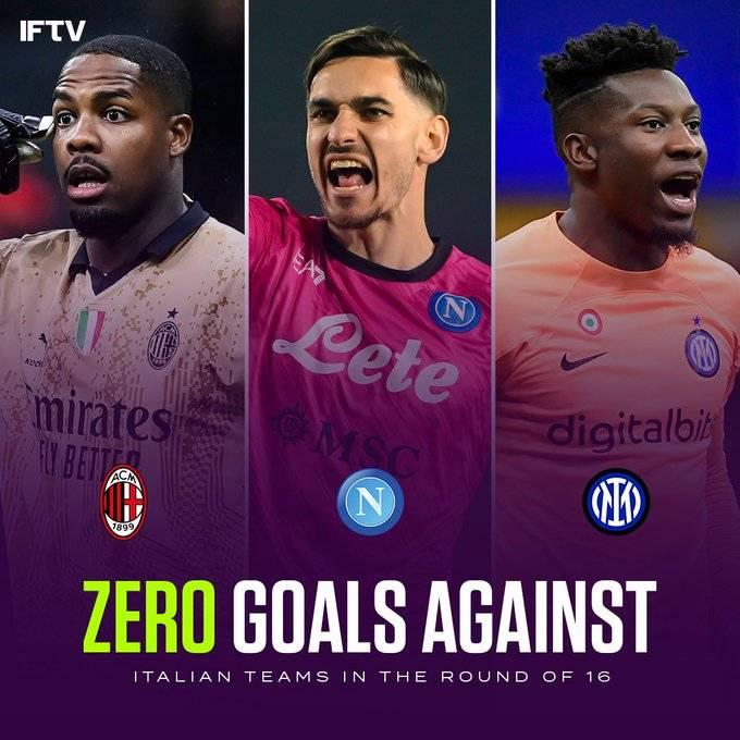 โดยตลอดทั้ง 2 เลก ของ Champions League รอบ 16 ทีมสุดท้าย ทีมจากอิตาลีมีสถิติการเสียประตูเป็น 0️⃣