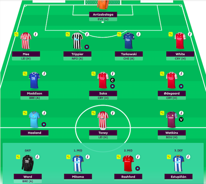 อย่างไรก็ดี ซาก้ายังคงมีบทบาทสำคัญในเกมรุกของอาร์เซน่อล ถึงนัดถล่มฟูแล่มล่าสุด จะมีส่วนร่วมในจังหวะสุดท้ายน้อยผิดคาด แต่ยังไงหากคุณมีเขาในทีม เกมเจอพาเลซยังน่าถือไว้ต่อ และโดยส่วนตัว ผมมองว่าเขาเป็นแคนดิเดตกัปตันเลยด้วยซ้ำ