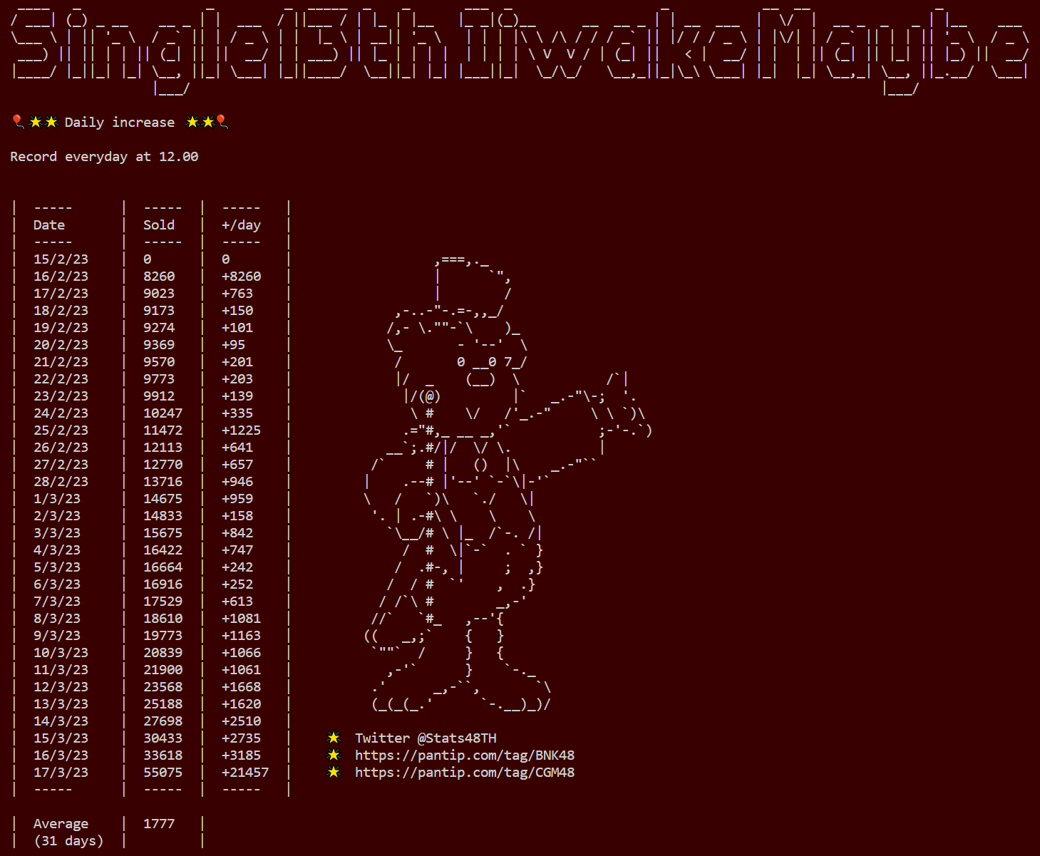 สรุปยอดขายเธียเตอร์ CGM48 Team C: Stage RESET 22 Nov 2024 - รอบ 17.00-19.00 ยอดขาย 107 \ 300 ที่นั่ง 23 Nov 2024 - รอบ 11.00-13.00 ยอดขาย 93 \