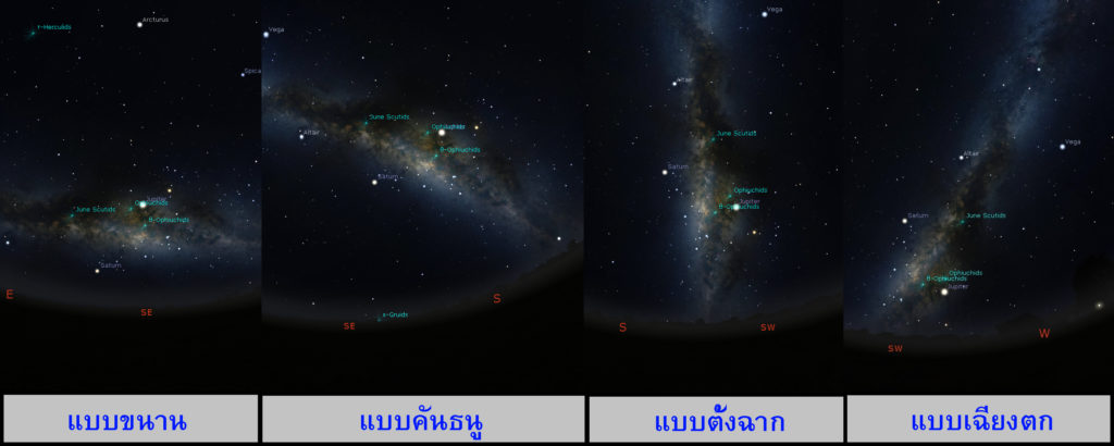 แบบตั้งฉาก(ตั้งโด่เด่) ซึ่งจะปรากฏอยู่ทางทิศตะวันตกเฉียงใต้ หรือหลังจากที่ทางช้างเผือกโค้งคันธนู 3 ชั่วโมง