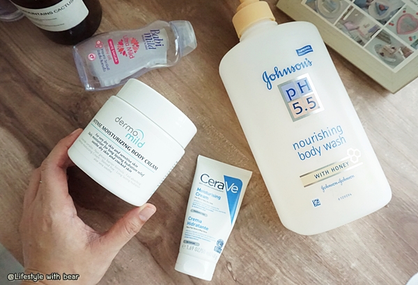 เริ่มต้นด้วยครีมอาบน้ำก่อนเลย จริงๆ เราใช้มาหลายตัวมาก แต่มาถูกใจกับ Johnson PH 5.5 รุ่นนี้แหละ จริงๆ ถ้าเป็นครีมอาบน้ำของเด็กก็ค่อนข้างจะดีกับคนที่ผิวแห้งอยู่แล้ว แต่เรารู้สึกว่ารุ่น PH 5.5 ใช้แล้วผิวไม่ค่อยแห้ง หลังอาบน้ำผิวจะไม่เอี๊ยด เหมือนเค้าเก็บความชุ่มชื้นเอาไว้ในผิวมากกว่ารุ่นอื่นๆ ทำให้ผิวสมดุล