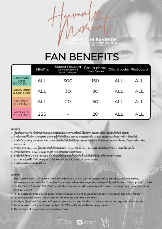 “Heavenly Moment” Kim Mingue Fanmeet in Bangkok เริ่มเปิดจำหน่ายบัตรอย่างเป็นทางการ ในวันอาทิตย์ที่ 2 เมษายน 2566 เป็นต้นไป ผ่านทาง Thaiticket Major บัตรราคา 5,600 / 4,600 / 3,600 และ 2,600 บาท สำหรับรายละเอียดเพิ่มเติมและผังที่นั่ง ติดตามได้ทาง Facebook :