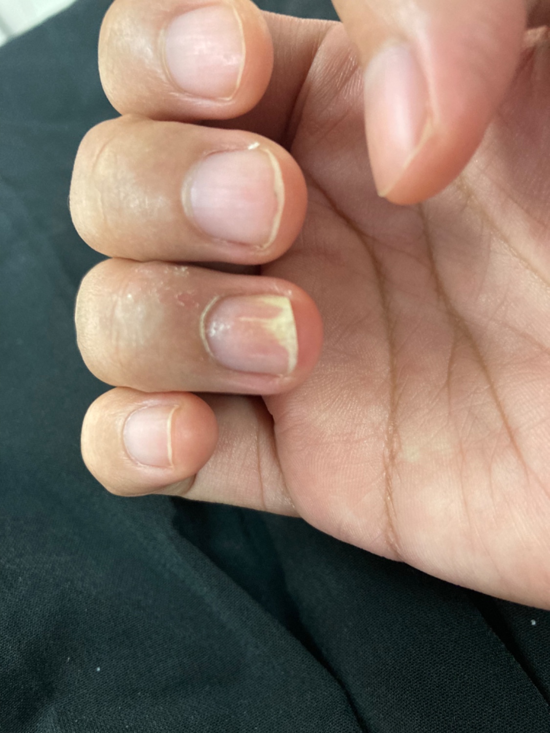 ช่วยด้วยค่ะเหตุจากตัดเล็บลึกเกินทำให้มีหนังโผล่ออกมานิดหน่อย พอนั้นเราคันมากกกเลยเอาฟันไปขูดๆที่เนื้อตามภาพ จากนั้นมันก็เริ่มแบบหนังเเตกแข็งแล้วเราไปเเกะทำให้มันเป็นดังภาพ(เหมือนปากแตกแล้วไปแกะมัน) ที