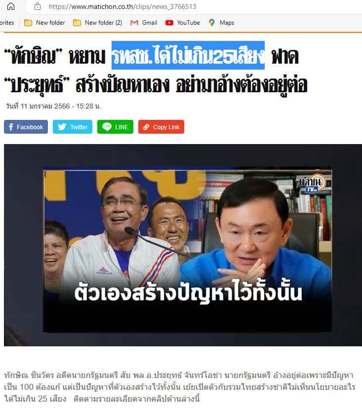 "ทักษิณ" หยาม รทสช.ได้ไม่เกิน25เสียง ฟาด "ประยุทธ์" สร้างปัญหาเอง อย่ามาอ้างต้องอยู่ต่อ