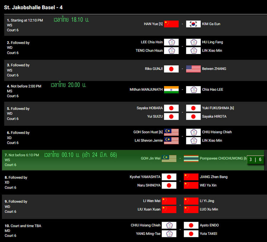 แข่งเวลา 00.10 น. (เช้า 24 มี.ค. 66) (คอร์ท 4 มีถ่ายทอดสด)