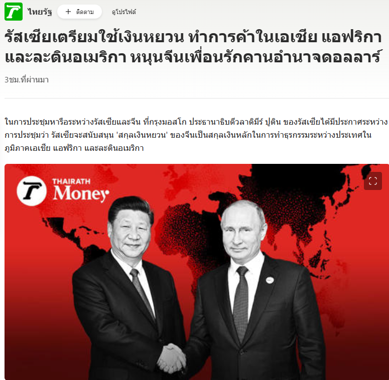 รัสเซียเตรียมใช้เงินหยวน ทำการค้าในเอเชีย แอฟริกาและละตินอเมริกา หนุนจีนเพื่อนรักคานอำนาจดอลลาร์ (thairath.co.th)