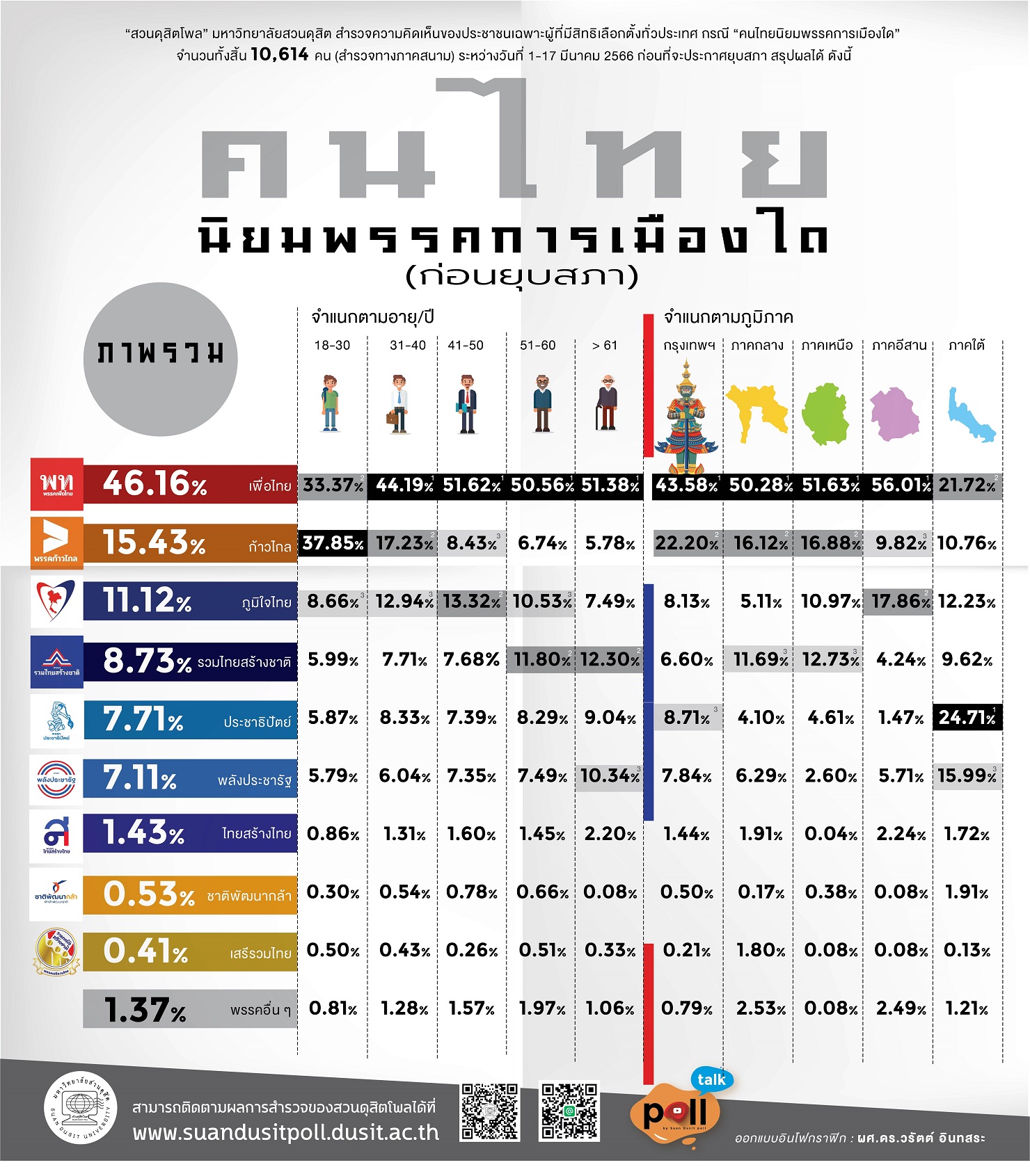 สวนดุสิตโพล วันนี้ เพื่อไทยนำโด่ง
