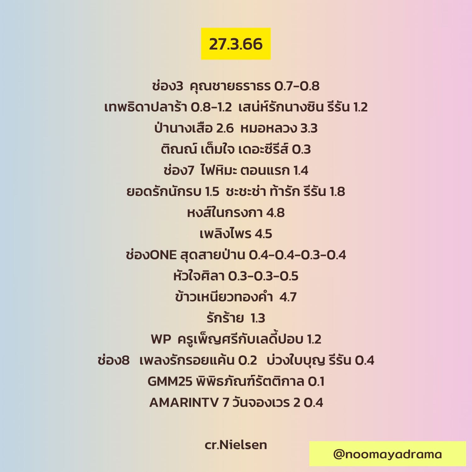 เรตติ้งรวมทั่วประเทศ วันที่ 27 มี.ค. 66 • วันของช่อง7 ฟาดทั้ง 2, หมอหลวงก็ขึ้น!
