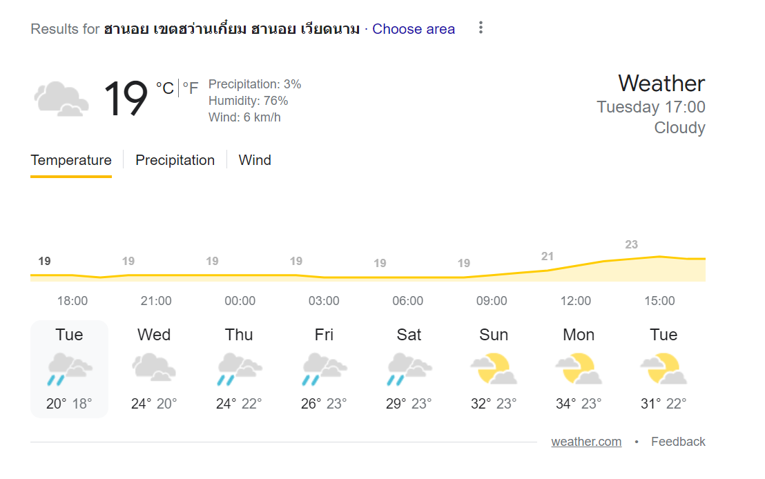 ดู Google weather ในสัปดาห์นี้ เอาแค่สัปดาห์เดียว เวียดนามภาคเหนือ ฮานอย ไฮฟอง อุณหภูมิสูงสุดตอนกลางวันถือว่าเย็นสบายเลย 21-22 องศา เท่าที่ดูฝนตกด้วย แต่แค่ฝนอย่างเดียวไม่น่าจะ 20 ต้น ๆ ได้ขนาดนี้ อา