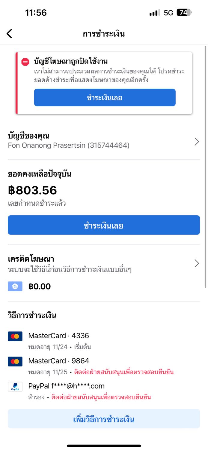 ชำระค่าโฆษณาบนอินสตาแกรมไม่ได้