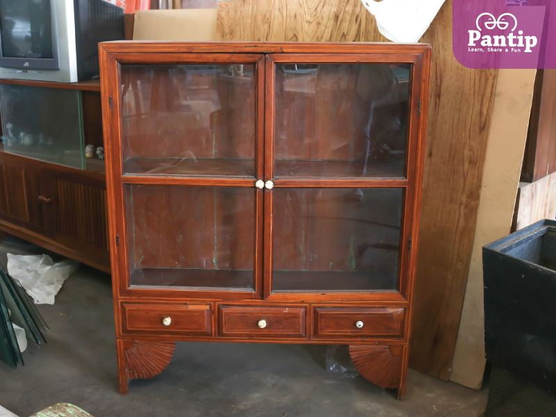 ตู้ไม้สักทอง ขาใบพัด ตัวเปิดปิดตู้ลักษณะคล้ายกระดุม เมื่อก่อนใช้ใส่เครื่องลายคราม ราคาขาย 1,500 บาท