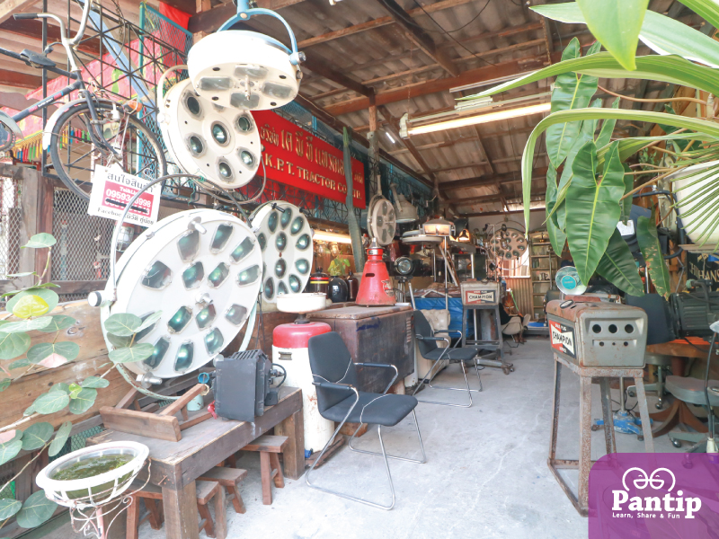 ส่วนร้านนี้แนวอินดัสเตรียล นำโคมไฟจากห้องผ่าตัดมาขาย บรรยากาศไซไฟ