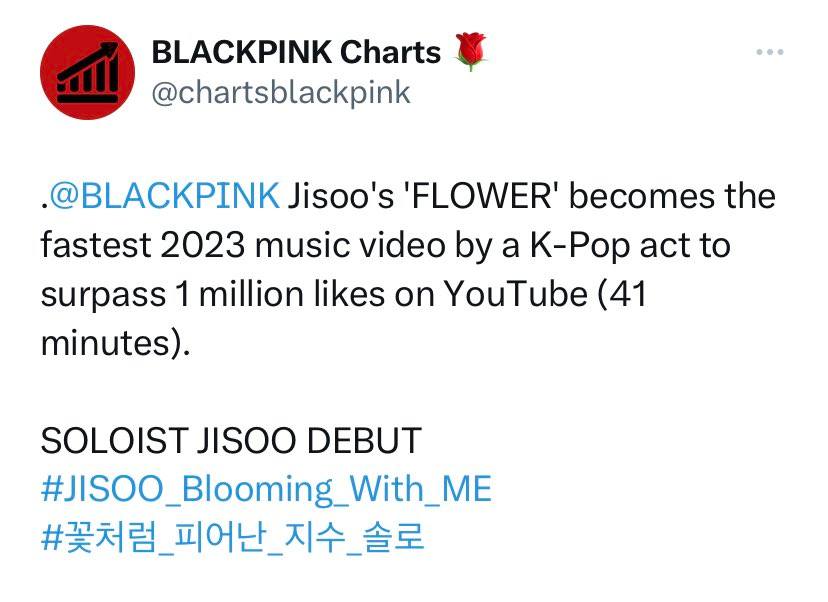 JISOO - ‘꽃(FLOWER)’ M/V กลายเป็นมิวสิควิดีโอเพลง K-POP ที่มียอดไลค์เกิน 1 ล้านไลค์บน YouTube ในปี 2023 เร็วที่สุด 41นาที