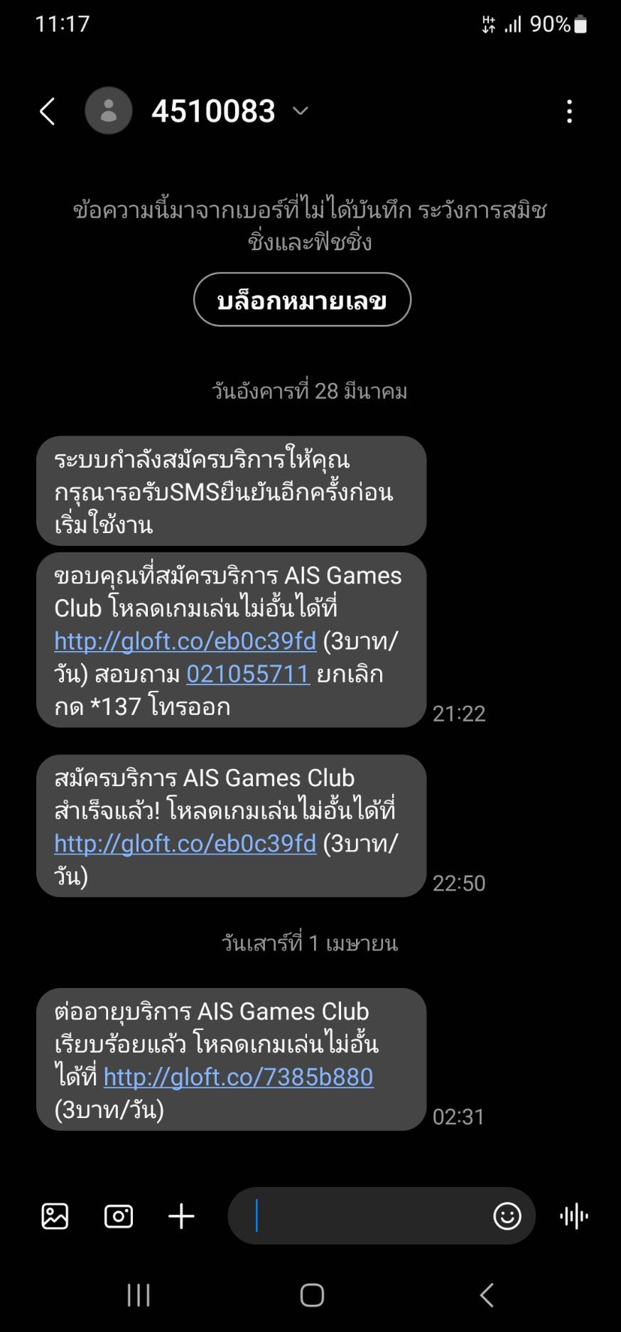 ผมเพิ่งเปิดข้อความไปเจอว่า มีการสมัครบริการของ AIS Games Club ตามภาพที่แนบ ซึ่งผมไม่ได้สมัครเอง อยู่ดีดีก็ได้ข้อความนี้มา จึงอยากทราบว่า นี่เป็นบริการจาก ais เหรอครับ คิดค่าบริการรึเปล่า ณ ตอนนี้คือผมเสียเงินไปแล้วเหรอ ทำไมระบบสมัครให้เองแบบนี้ แล้วการตั้งชื่อแบบนี้ คือถือว่าเป็นบริการจาก ais โดยตรงเหรอครับ
